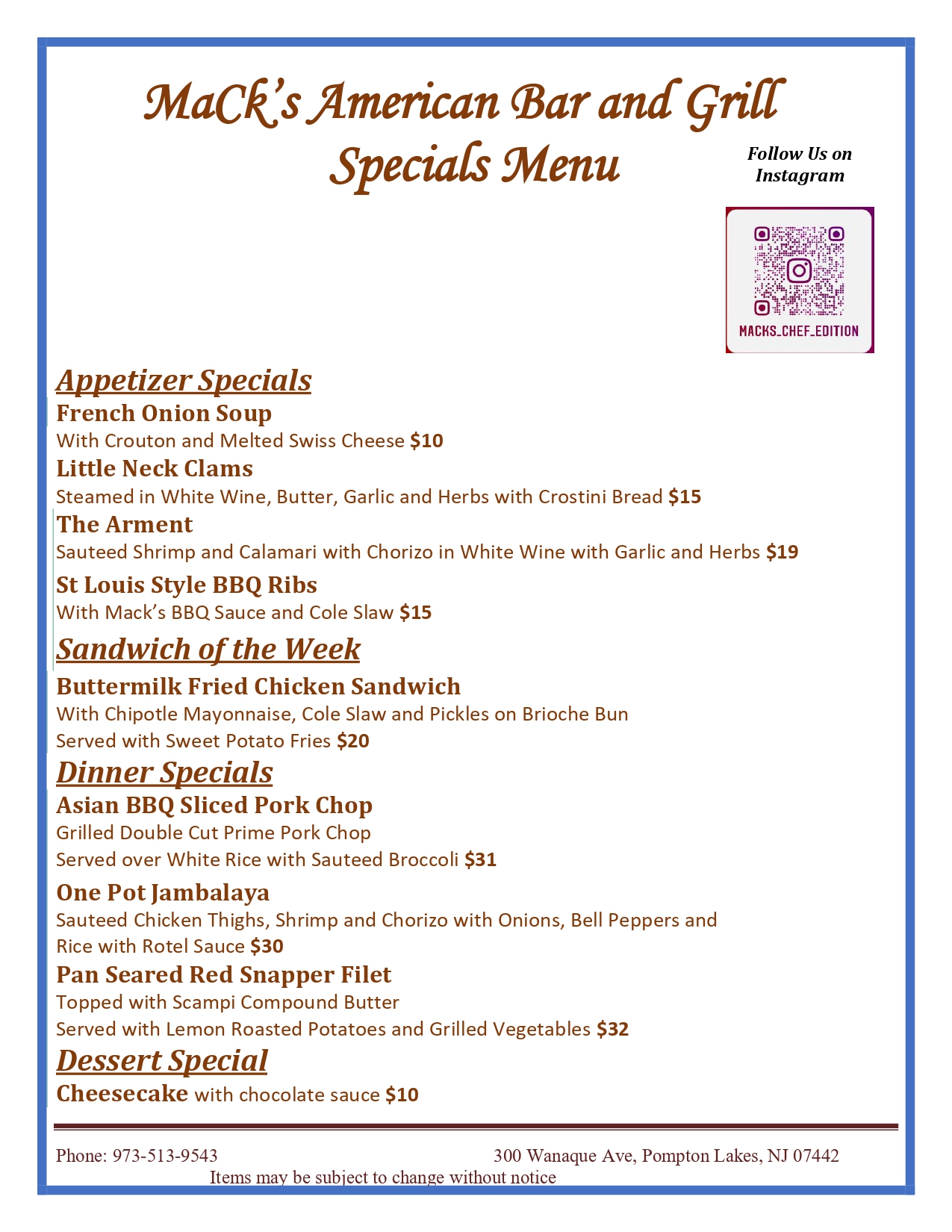 Don’t look any further if you’re in a mood to try out a special dish. Come to Mack’s American Bar & Grill right away! You can choose and order from the appetizer, dinner, and dessert specials we offer. All our dishes are made using fine and fresh ingredients.